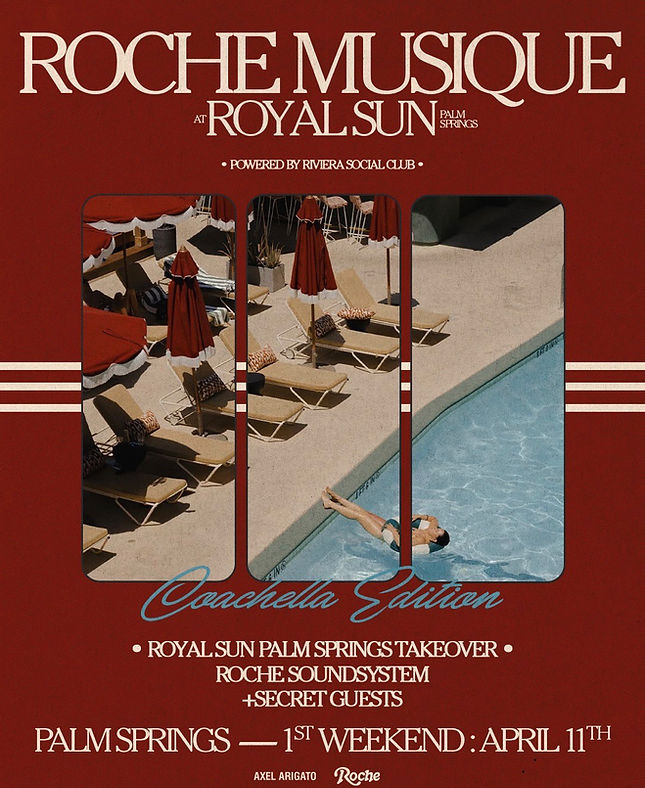 Riviera Social Club present an intimate pre-festival pool party with the renowned Roche Musique label at the Royal Sun Hotel, featuring some of your favorite Parisian djs + secret guests!