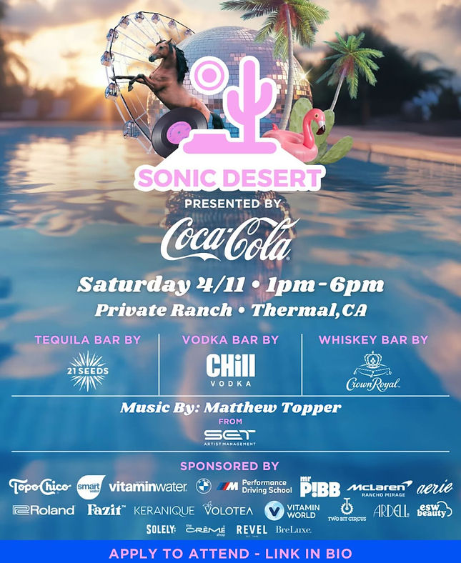 Description: Sonic desert returns for another year in the desert! Known for an interactive Saturday daytime event with brand activations, hosted bites and cocktails. IV hydration, brand partners will be announced soon!